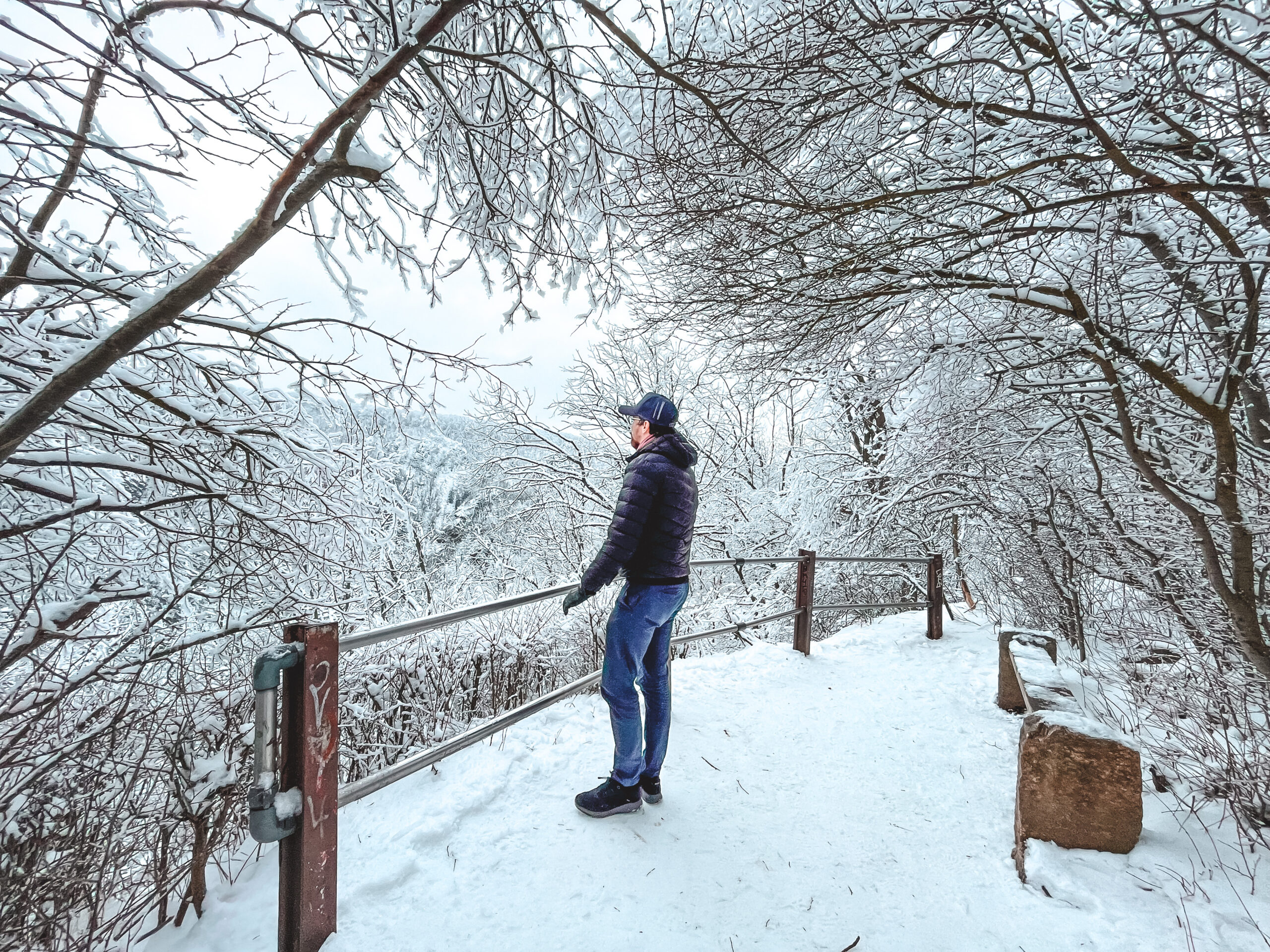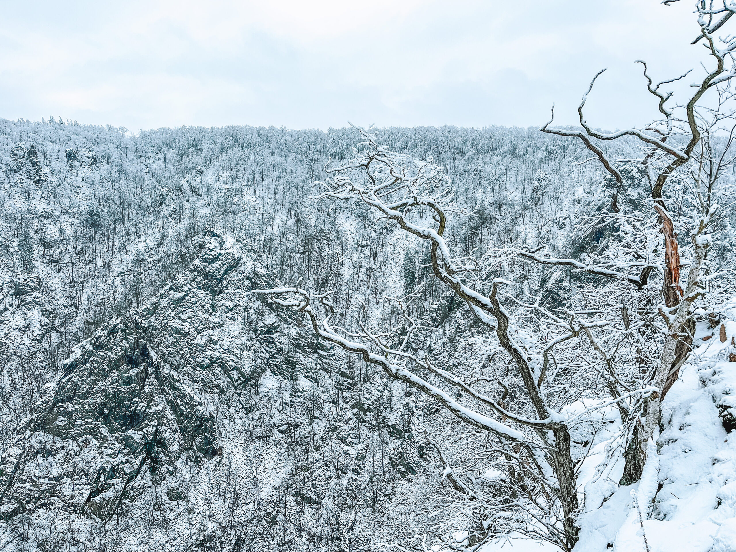 We drove directly from Berlin and got to the valley by driving through Thale, a town in the Harz (454 m above sea level, district in Saxony-Anhalt). We parked right next to Akzent Berghotel Rosstrappe and made our way to the view point which was really close in proximity walking distance. I was really excited when I realized that the valley was covered in snow.