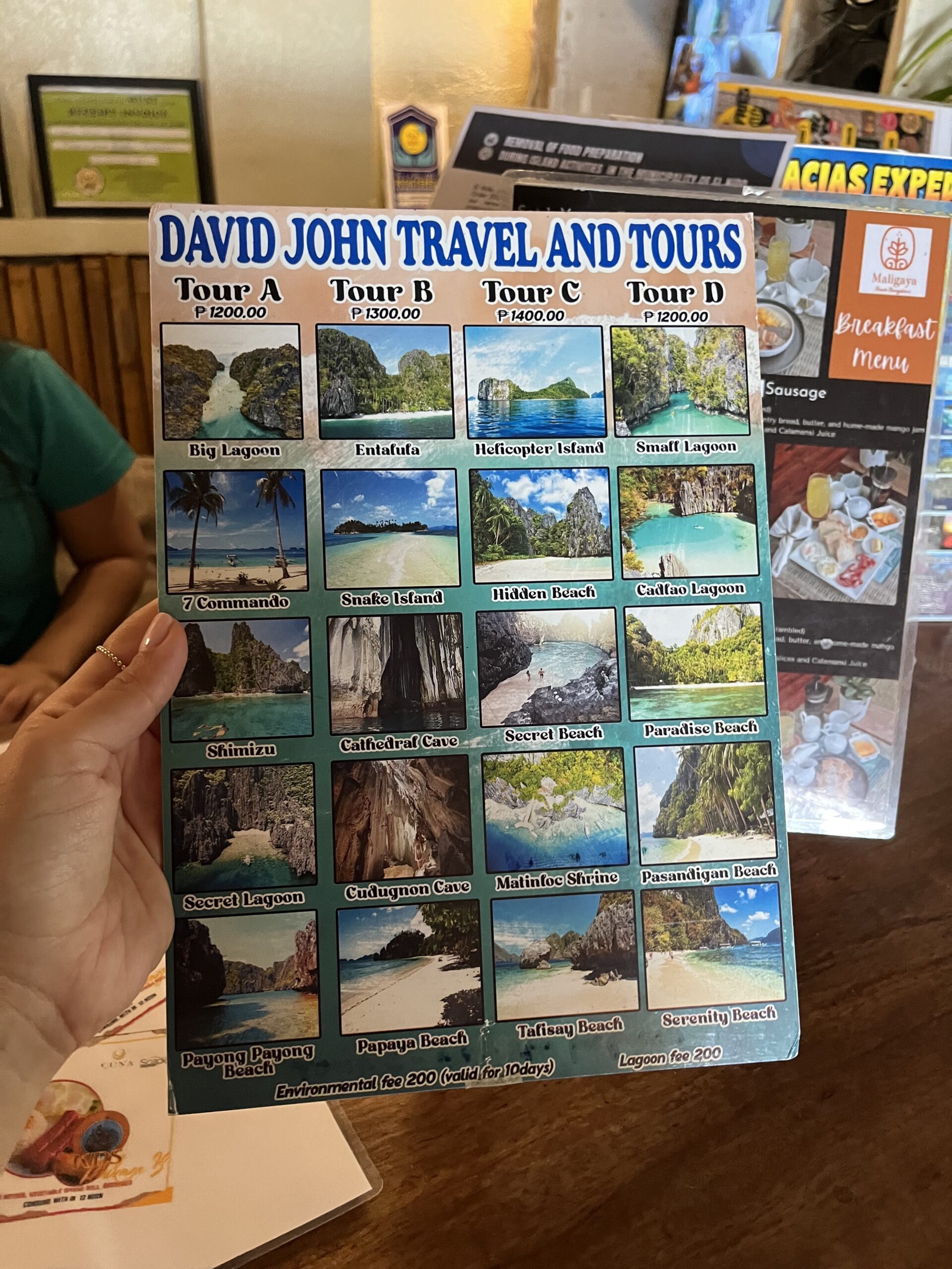 • Tour A, B, C & D: There are some predetermined tours called A, B, C and D many local providers are offering. We have tried tours A and B and they were pretty amazing. It’s definitely worth it as you can visit so many beautiful little islands, snorkel, kayak (depending on the tour) and it’s a really good value for money. Prices vary between Php 1,200-1,400 (Circa €22-25) for a day tour that also includes your lunch. We booked our tours via our hotels which is the usual way these tours are arranged. Our tour company was “David John Travel and Tours” and the tour guides were absolutely amazing, helpful, knowledgeable and supportive – Reggie and John John you rock. You can see an overview of the destinations and respective pricing below.